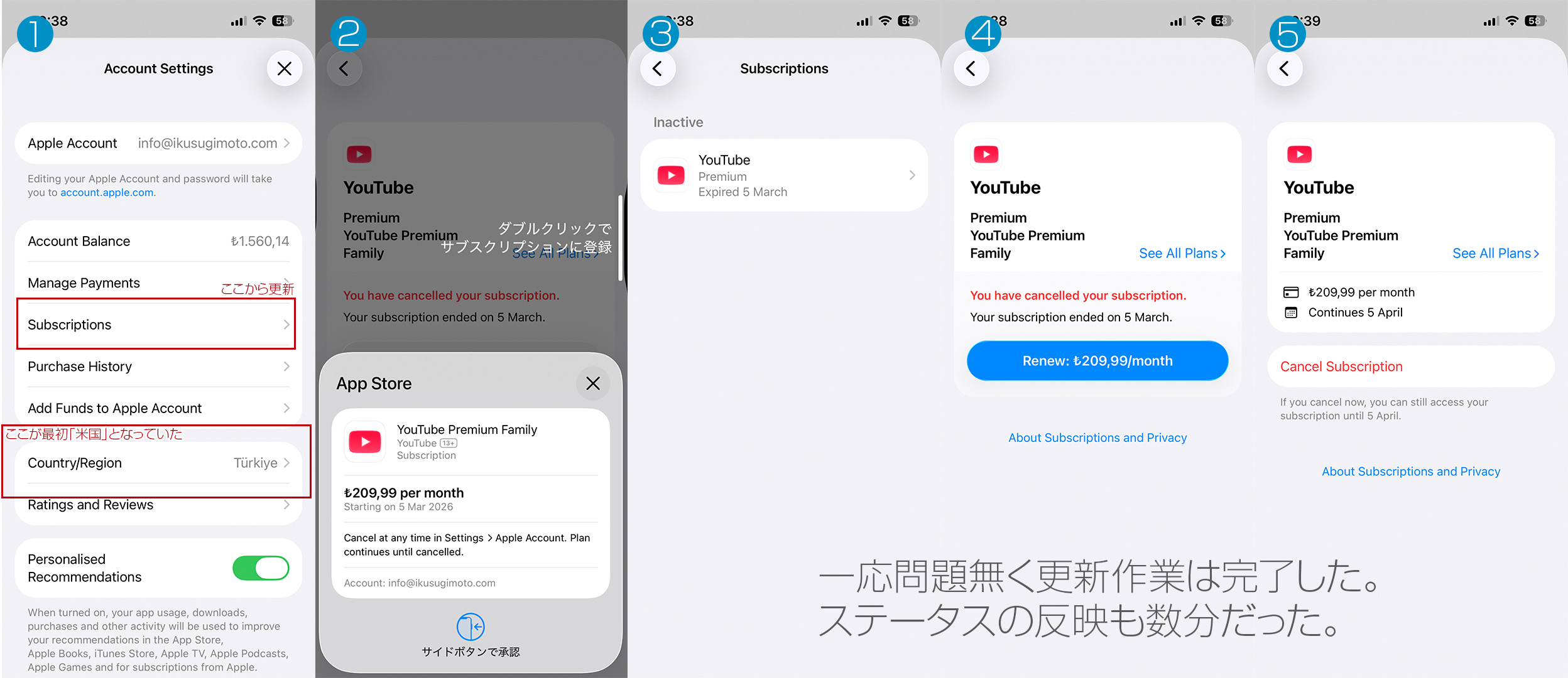トルコアカウントで更新・支払い⇒その状態でYouTubeアプリを起動⇒Premiumを確認⇒Premiumを確認できたらAppleアカウントを【本命】に戻す
